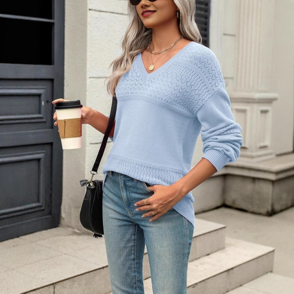 商品属性 [111] Sweater [222] Knitwear [333] Women's Knit Sweater [上市年份/季节] 2025年春季 [主要下游销售地区1] 欧美 [主要下游销售地区2] 欧美 [厚薄] 中等 [图案] 纯色 [工艺] 针织 [是否跨境货源] 是 [款式] 套头 [流行元素] 勾花 [版型] 宽松型 [穿着方式] 套头 [组合形式] 单件 [衣长] 普通款(50cm<衣长≤65cm) [袖型] 常规袖 [袖长] 长袖 [跨境风格类型] 气质优雅 [门襟] 无扣 [面料名称] 化纤混纺 [领型] V字领 [风格] 性感风 [风格类型] 私服名媛
