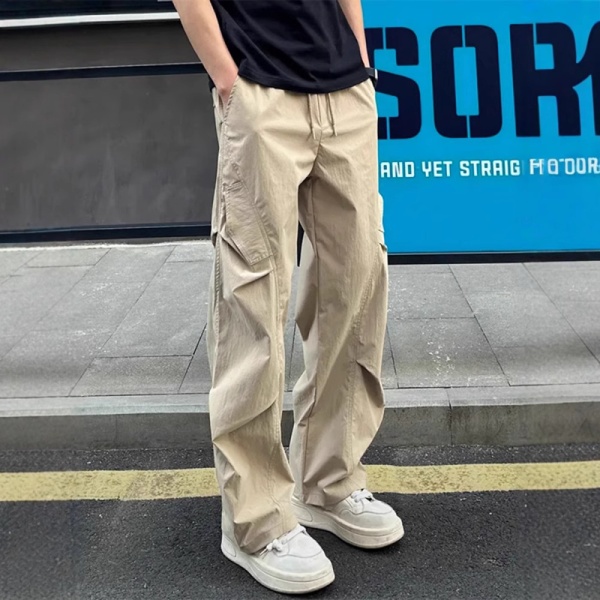 商品属性 [上市年份/季节] 2025年春季 [主要下游平台] ebay,亚马逊,wish,速卖通,独立站,LAZADA,其他 [主要销售地区] 非洲,欧洲,南美,东南亚,北美,东北亚,中东,其他 [主面料成分] 聚酯纤维(涤纶) [主面料成分的含量] 100 [厚薄] 薄款 [原创设计货源] 是 [图案] 纯色 [工艺] 褶皱 [库存类型] 整单 [弹力] 微弹 [是否库存] 是 [是否有腰带] 无腰带 [是否跨境出口专供货源] 是 [有可授权的自有品牌] 是 [有无质检报告] 否 [材质功能] 其他 [款式] 工装裤 [款式细节] 辑明线 [淘货类别] 青春流行(18-24岁) [类别] 运动休闲裤 [腰型] 中腰 [裤型] 宽松型 [裤脚口款式] 直筒 [裤长] 长裤 [裤门襟] 系绳闭襟 [误差范围] 无误差 [货源类别] 现货 [质检报告编号] 01 [适合人群] 青少年 [适合季节] 夏季 [适用场景] 休闲 [面料] 弹力面料 [面料名称] 化纤类混纺 [风格] 港风