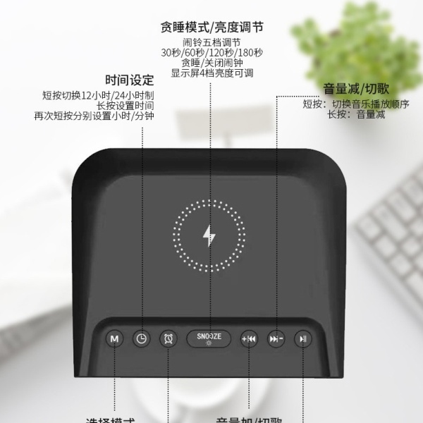 产品功能:TF卡播放,USB播放,蓝牙,AUX音频,FM收音机,手机无线充电,显示时间。