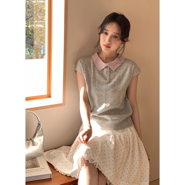 商品属性 [上市年份/季节] 2025年春季 [主面料成分] 腈纶 [主面料成分含量] 30%(含)-50%(不含) [厚薄] 薄 [图案] 纯色 [工艺] 免烫处理 [是否跨境货源] 否 [款式] 无袖款 [流行元素] 纯色 [版型] 常规 [穿着方式] 套头 [组合形式] 单件 [衣长] 普通款(50cm<衣长≤65cm) [袖型] 飞飞袖 [袖长] 无袖 [门襟] 套头 [面料名称] 39%涤纶;35%抗起球腈纶;20%锦纶;6%丝光羊毛 [领型] POLO领 [风格] 少女风 [风格类型] 清新甜美