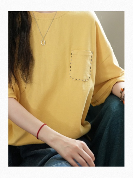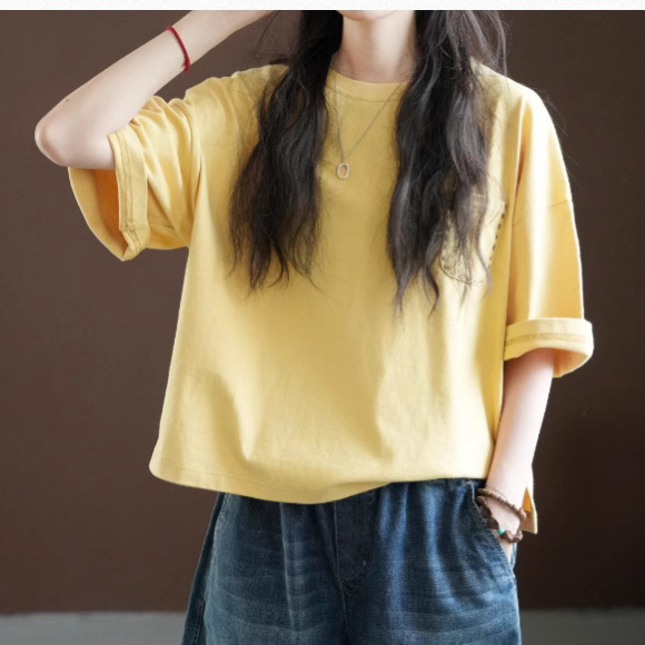 商品属性 [上市年份/季节] 2025夏季 [主面料成分] 棉 [主面料成分含量] 95%及以上 [图案] 纯色 [工艺] 刺绣/绣花 [是否跨境货源] 否 [款式] 套头 [流行元素] 口袋 [版型] 宽松型 [衣长] 普通款(50cm<衣长≤65cm) [袖型] 常规 [袖长] 短袖 [面料名称] 棉 [领型] 圆领 [风格] 通勤风 [风格类型] 气质通勤
