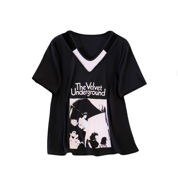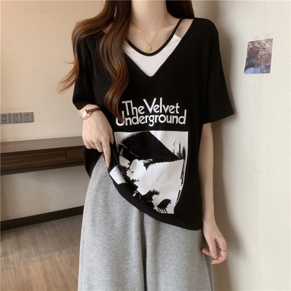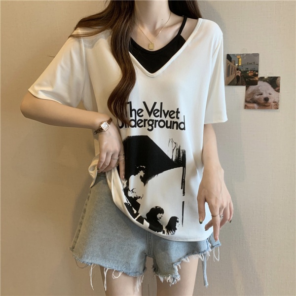 商品属性 [上市年份/季节] 2024年夏季 [主要下游销售地区1] 东南亚 [主要下游销售地区2] 欧美 [主面料成分] 涤纶(聚酯纤维) [主面料成分含量] 95%及以上 [图案] 几何图案 [工艺] 拼贴/拼接 [是否跨境货源] 是 [款式] 假两件套 [流行元素] 系带 [版型] 宽松型 [衣长] 普通款(50cm<衣长≤65cm) [袖型] 常规袖 [袖长] 短袖 [跨境风格类型] 甜美清新 [面料名称] 涤纶 [领型] V字领 [风格] 甜美风 [风格类型] 清新甜美